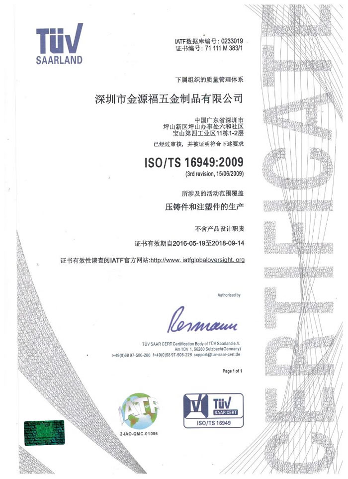 深圳市金源福五金制品有限公司成立于2003年。公司擁有8000多平方米生產廠地、開發與管理精英人才、技術專業、設備精良、交通便利、服務周全、具體設計、開發、制模、出樣、生產到成品出貨一體化模式生產廠家。已通過ISO9001:2008ISO1440/TS16949:2009國際質量體系認證。專業生產鋅合金壓鑄、鋁合金壓鑄產品、汽車配件、汽車后視鏡支架、車載導航散熱器、LED散熱器、LED燈罩、數碼電子五金結構件、家具五金裝飾件、標牌(LOGO)等五金壓鑄產品。